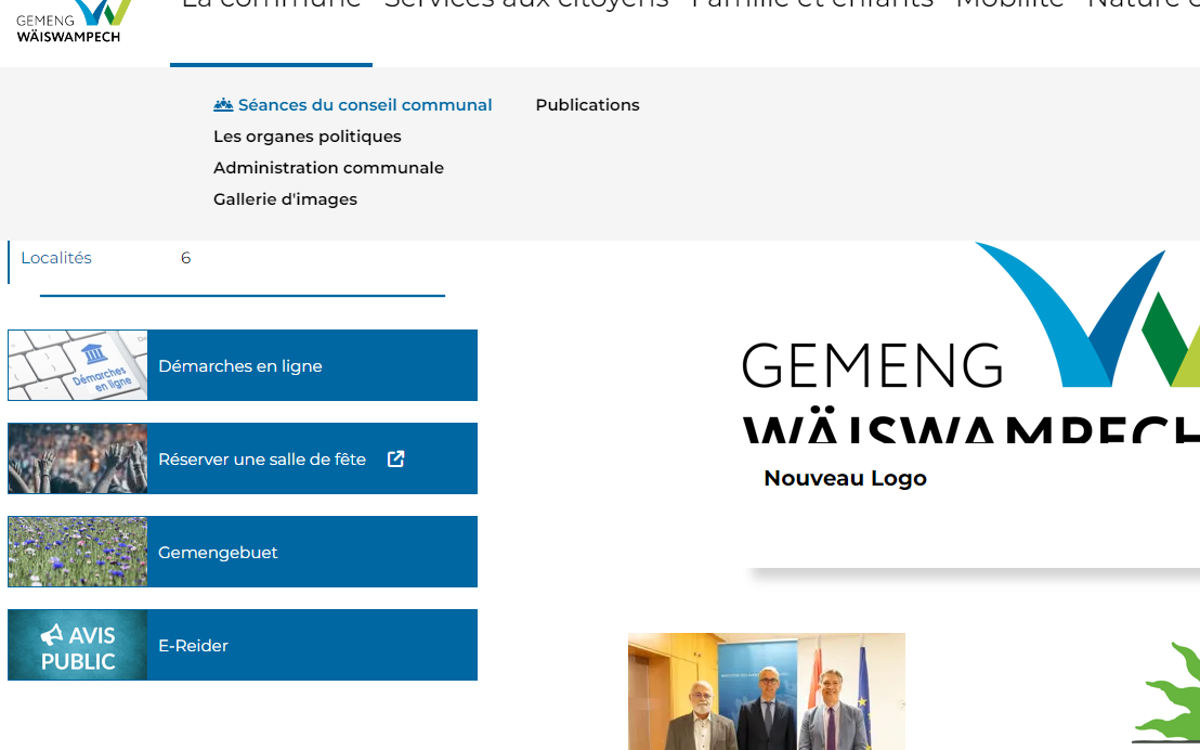Une grande nouveauté se trouve sous la rubrique "Démarches en ligne". Cette rubrique propose quelques démarches qui peuvent se faire de manière électronique. Ceci évite des déplacements à la commune et permet de nous soumettre ces demandes en dehors de nos heures d'ouverture. D'autres démarches vont être mises en ligne au fur et à mesure.