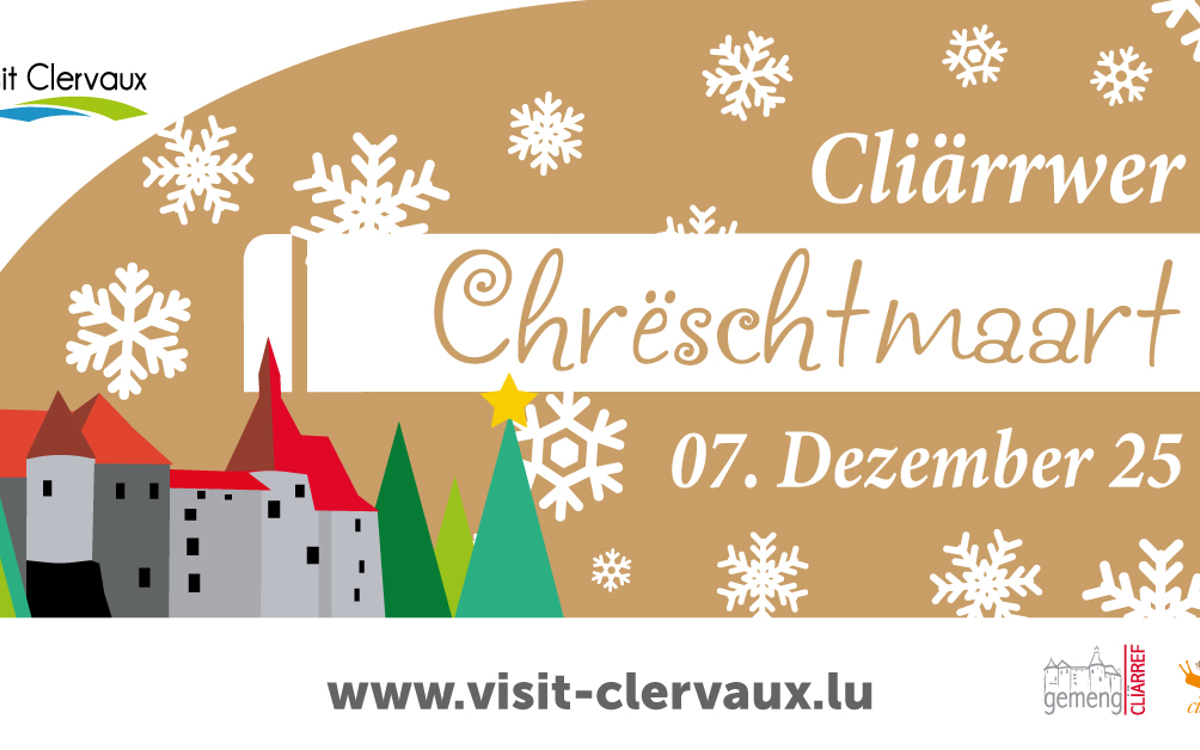 .Erleben Sie die zauberhafte Atmosphäre des “Chreschmaart” 2025 in Clervaux am Sonntag, den 7. Dezember, von 11:00 bis 20:00 Uhr. Die Stadt verwandelt sich an diesem Tag in ein richtiges Weihnachtsdorf, in dem der Zauber der Feiertage in jeder Straße und auf dem Marktplatz spürbar ist. Lassen Sie sich von den liebevoll gestalteten Ständen verzaubern, an denen Handwerker und Händler handgefertigte Dekorationen, Holzspielzeug, Leckereien und einzigartige Geschenke für Ihre Liebsten anbieten.