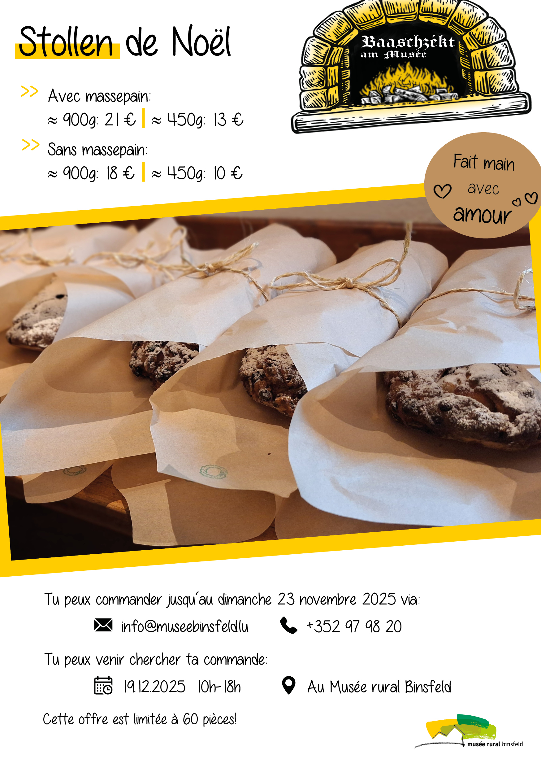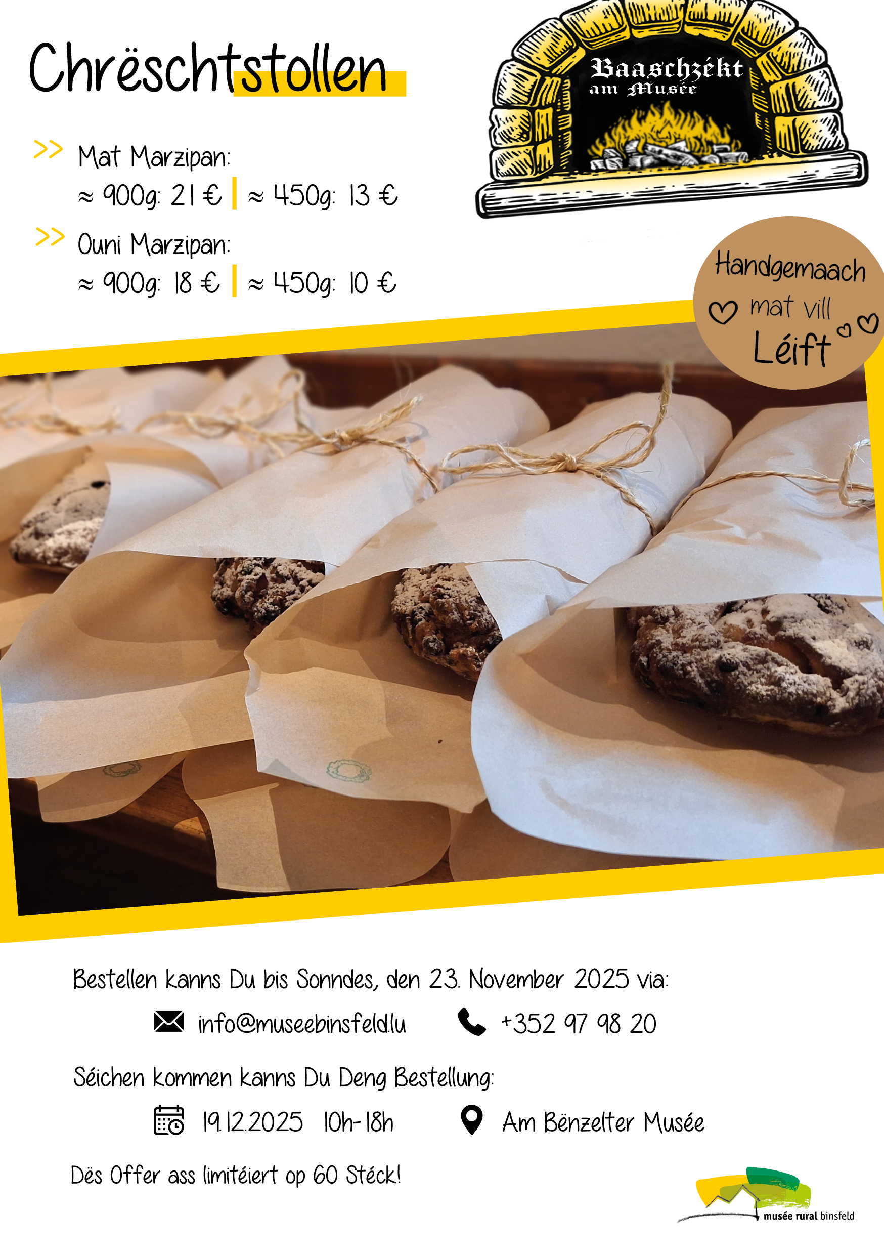News Musée rural Binsfeld - Chrëschtstollen auf Bestellung 12.11.2025 12.11.2025 Musée rural Binsfeld - Chrëschtsollen auf Bestellung News Flyer
