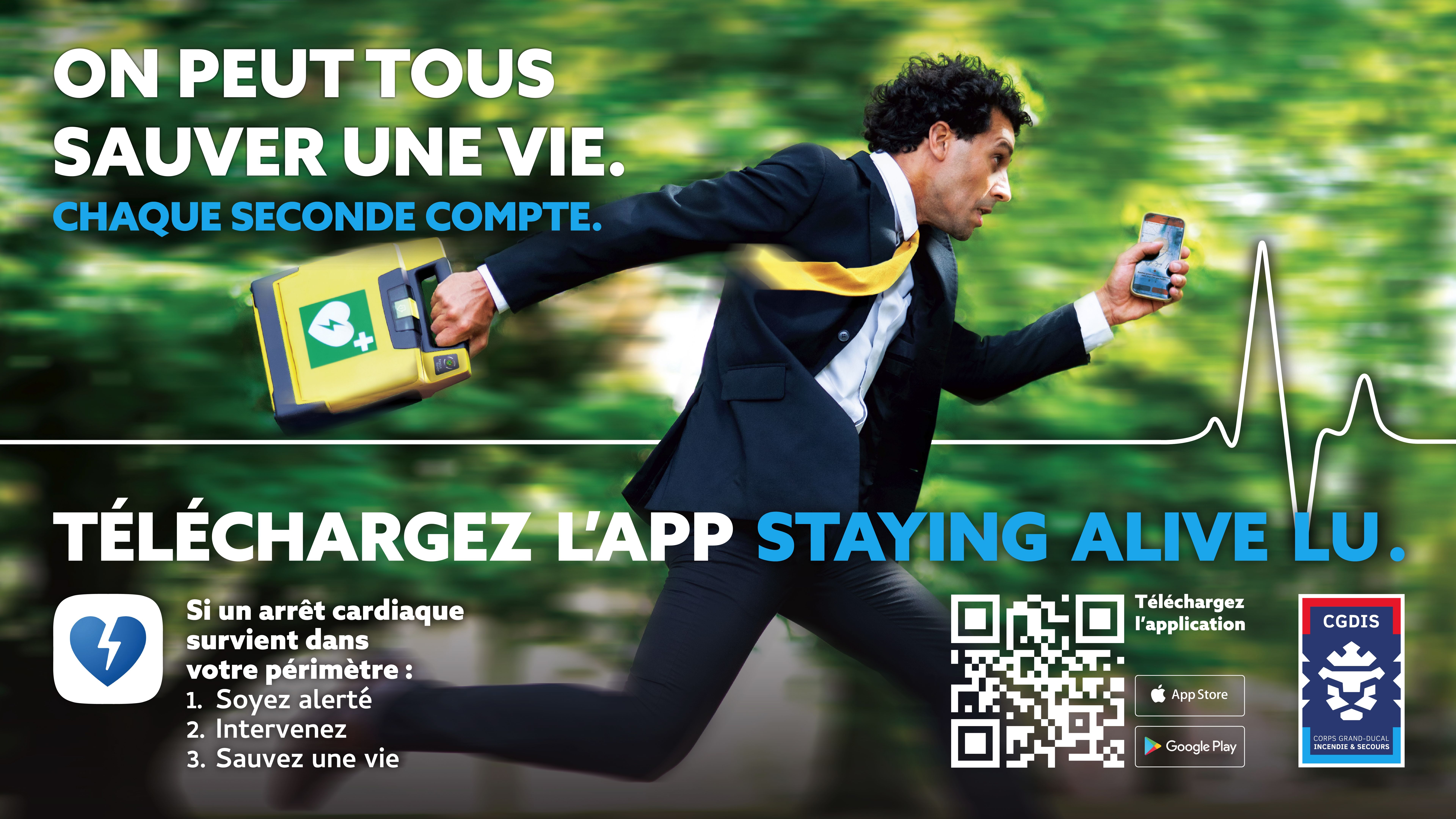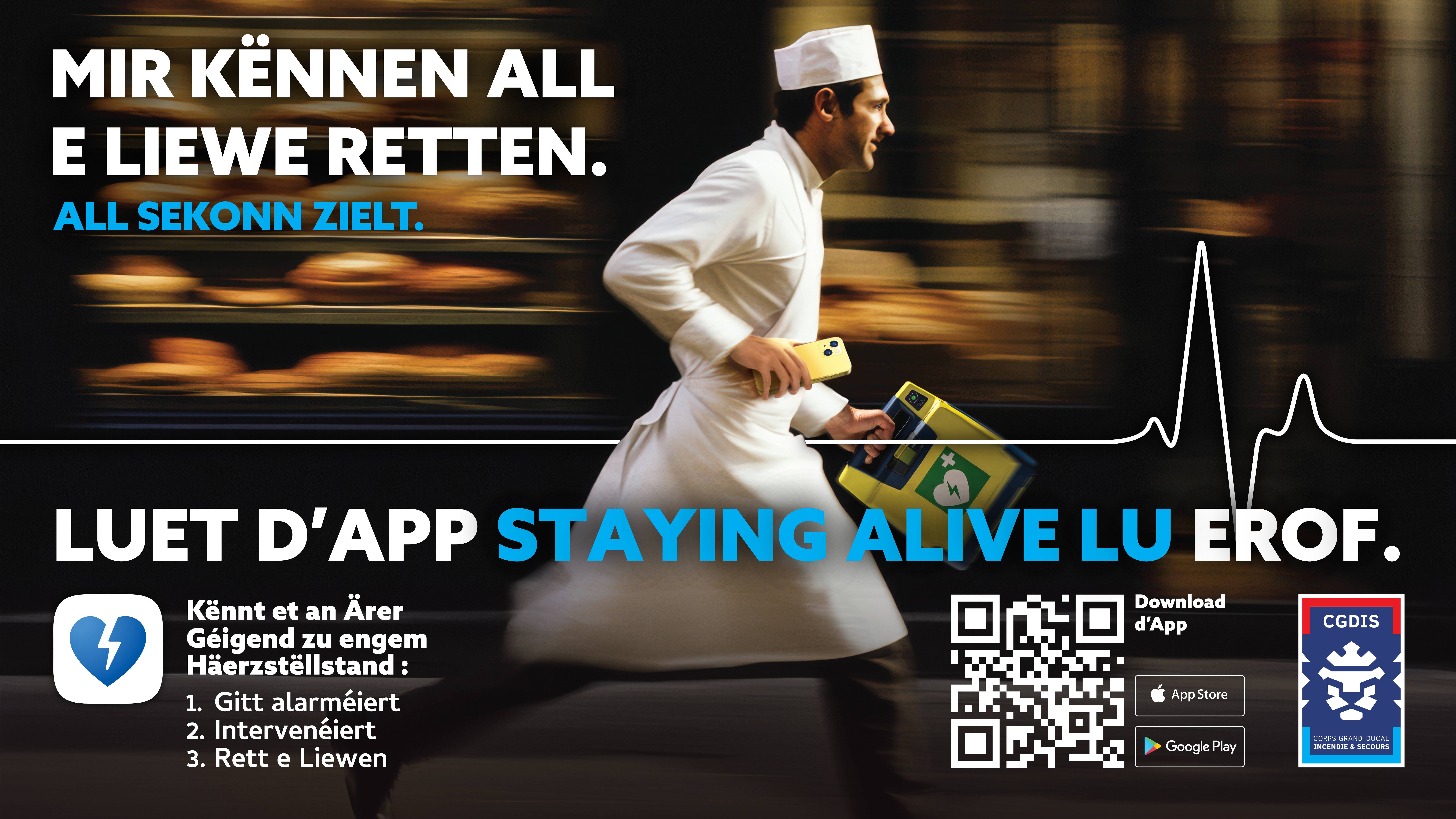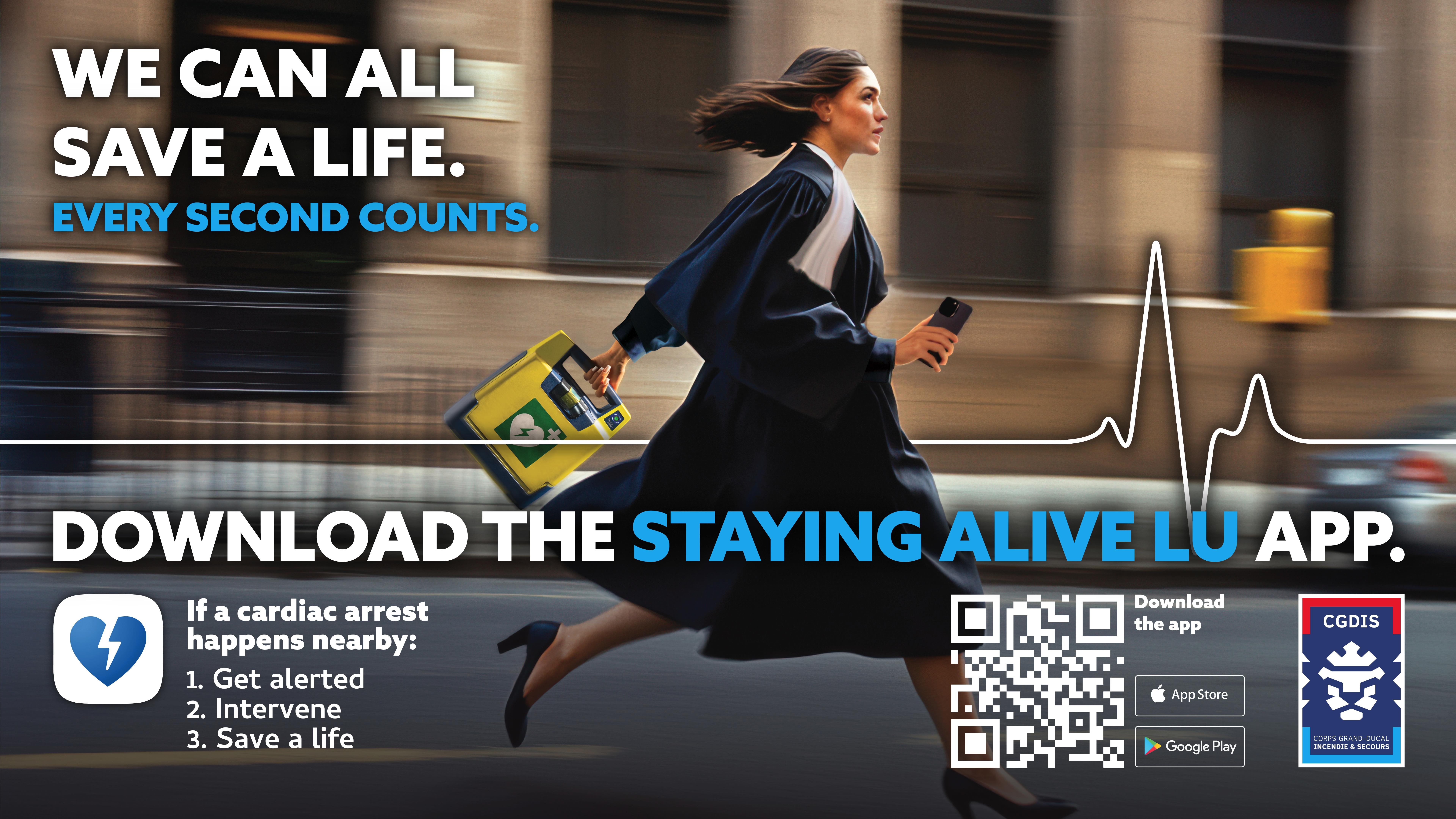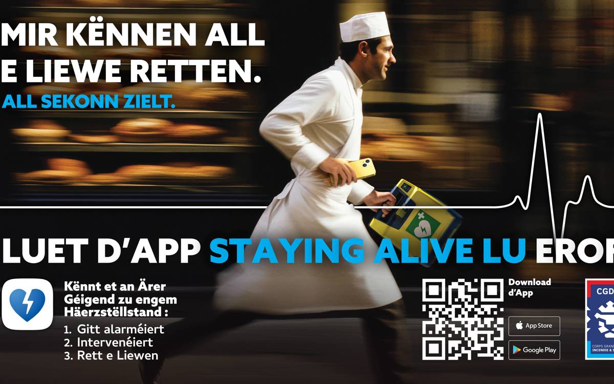 Staying Alive LU est un service qui permet au 112 de localiser et d’alerter des volontaires formés aux gestes de premiers secours en cas d’arrêt cardiaque à proximité afin de porter secours à la victime ou d’aller chercher un défibrillateur.